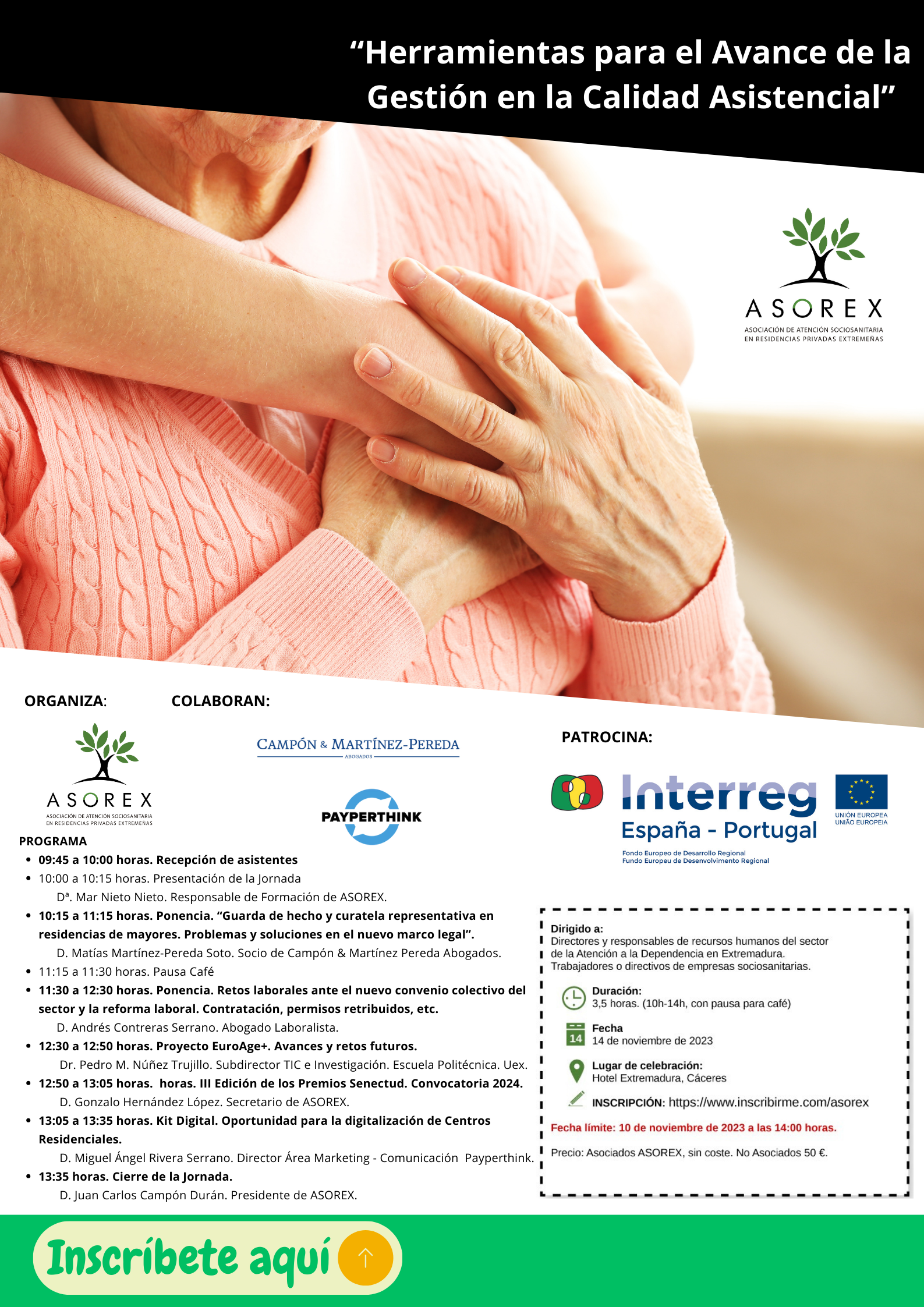 El próximo día 14 de Noviembre de 2023 tendrá lugar, en las Instalaciones del Hotel Extremadura de Cáceres, la Jornada «Herramientas para el Avance de la Gestión en la Calidad Asistencial», organizada por la Asociación de Atención Sociosanitaria en Residencias Privadas Extremeñas (ASOREX). La Jornada, enmarcada en una de las aportaciones que ASOREX hace a las empresas asociadas, contará con la participación de profesionales de distintas áreas, y se enmarca dentro del proyecto EUROAGE+.